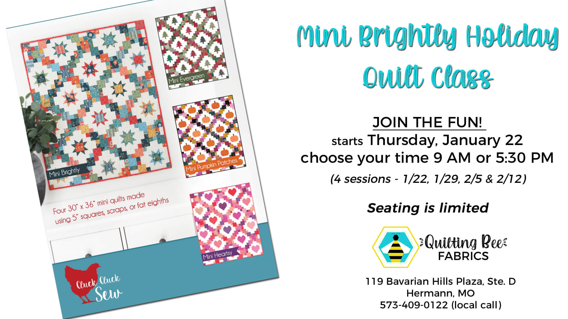 Register online at quiltingbeefabrics.com or call Aimee at 573-409-0122 (local #)