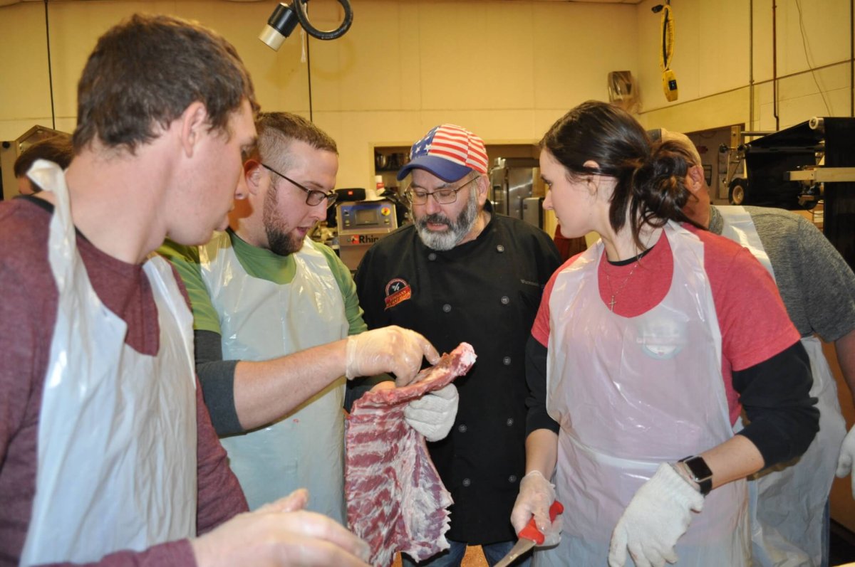 Reservations & TicketsLearn hands-on, the art of pig butchery, taught by three-time hall of fame butcher Wurstmeister Mike Sloan at the Hermann Wurst Haus. It is both informative and entertaining. Students will be involved in breaking down five sides of pork (approximately 600 lbs. dressed out) into chops, steaks, roasts, ribs, bacon, ham, jowl, lard, and sausage. Students will be able to identify the primal cuts and retail cuts, where they come from on the carcass, how to prepare them, shelf life, and some preservation and packaging methods. You will also learn the art of knife sharpening and cutting.