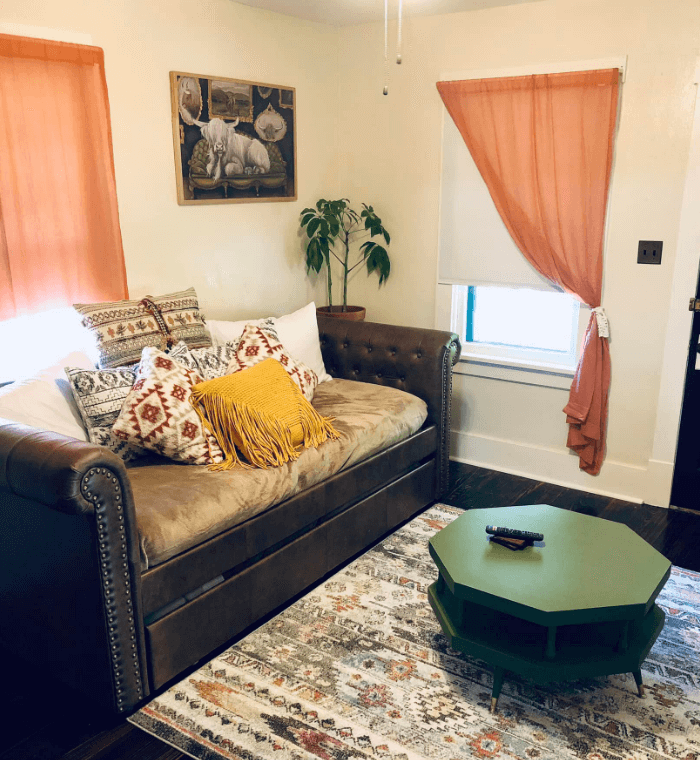 This property is a one bedroom home that can accommodate up to four people. There is a queen-sized bed in the bedroom and a daybed in the living room that can serve as a couch or be transformed into two separate twin beds. There is a fully functional kitchen and one bathroom with a stand-up shower/tub.
